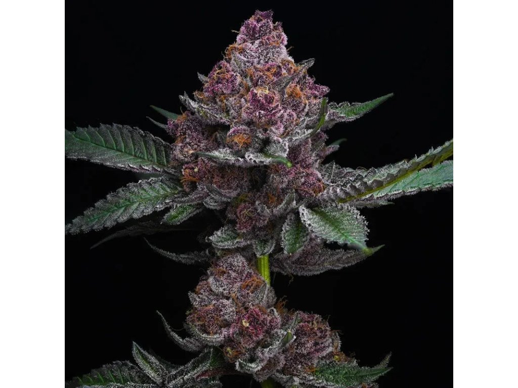 Indika hybrid s tmavě fialovými květy, sladkým citrusovým aroma a silnými relaxačními účinky.