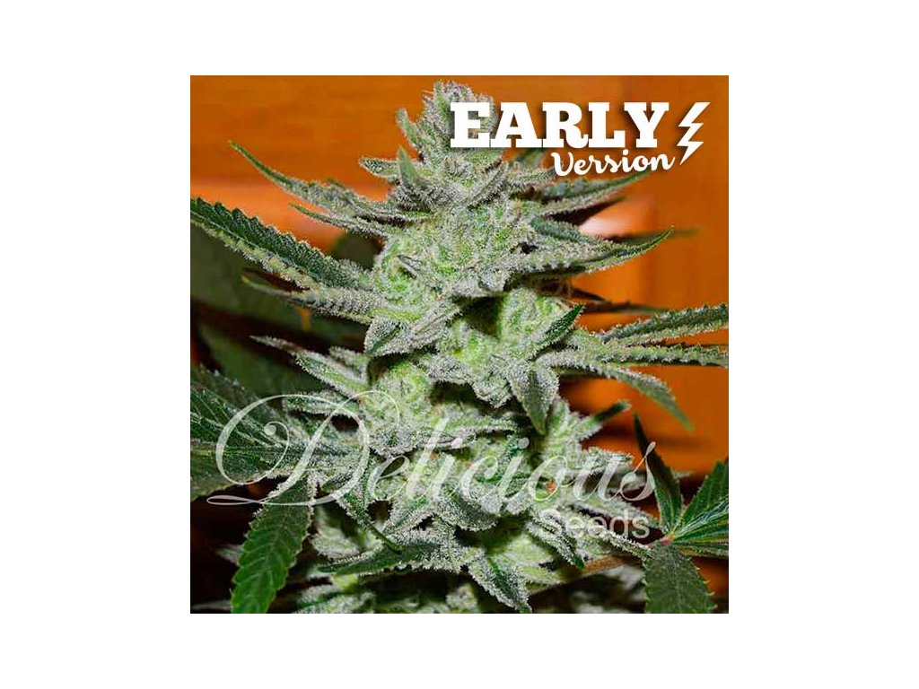 Unknown Kush - Early Version od Delicious Seeds je 50% sativa a 50% indika hybrid, který si zachovává vlastnosti původní feminizované verze, ale s výrazně kratší dobou kvetení pouhých 45 dní. Tato odrůda nabízí obsah THC až 23 % a produkuje bohaté množství trichomů, které pokrývají květy během kvetení. Aroma kombinuje vůně Haze a Kush s komplexními tóny sladkosti, kovového kadidla a citrusů. Chuť je sladká, s jemnými nuancemi kadidla a citrusových plodů. Účinky jsou silně narkotické a zároveň stimulující, což přináší pocit relaxace i klidu. Unknown Kush je vhodná pro léčbu chronické bolesti, poruch spánku nebo úzkosti. Rostliny jsou odolné vůči plísním i škůdcům a snadno se pěstují v různých podmínkách. Výnosy dosahují až 500 g/m² v interiéru a 900 g na rostlinu venku. Sklizeň venku je připravena začátkem září na severní polokouli.