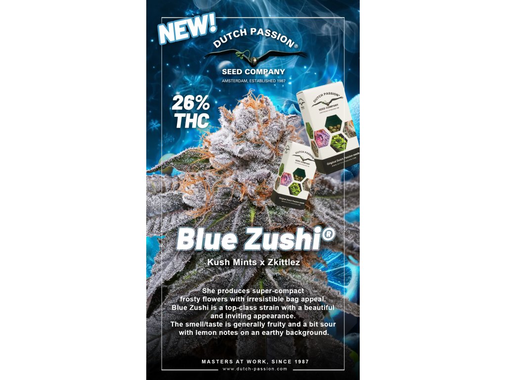 Blue Zushi od Dutch Passion je prémiová fotoperiodická odrůda vzniklá křížením Kush Mints a Zkittlez. Tento hybrid (indika-dominantní) nabízí vysoký obsah THC (20–25 %) a dobu kvetení 8–9 týdnů. Rostliny dorůstají střední velikosti a produkují husté, pryskyřičné květy s intenzivním aroma citrusů, země, květin a nafty. Některé fenotypy vykazují fialové nebo červené odstíny na listech a květech, což zvyšuje jejich vizuální přitažlivost. Účinky jsou silné a dlouhotrvající – kombinují relaxační tělesný efekt s euforickým "head high", ideální pro večerní užití nebo odpočinek po náročném dni. Výnosy dosahují až 500–600 g/m² v interiéru a 500–750 g na rostlinu venku za optimálních podmínek. Blue Zushi je snadno pěstovatelná odrůda vhodná pro SOG i SCROG techniky. Doporučuje se pěstování v suchém prostředí s nízkou vlhkostí během kvetení. Tato odrůda je oblíbená díky svému jedinečnému terpenovému profilu, robustnímu růstu a snadnému pěstování, což z ní činí ideální volbu pro každého pěstitele hledajícího špičkovou kvalitu.Doplňkové parametry
