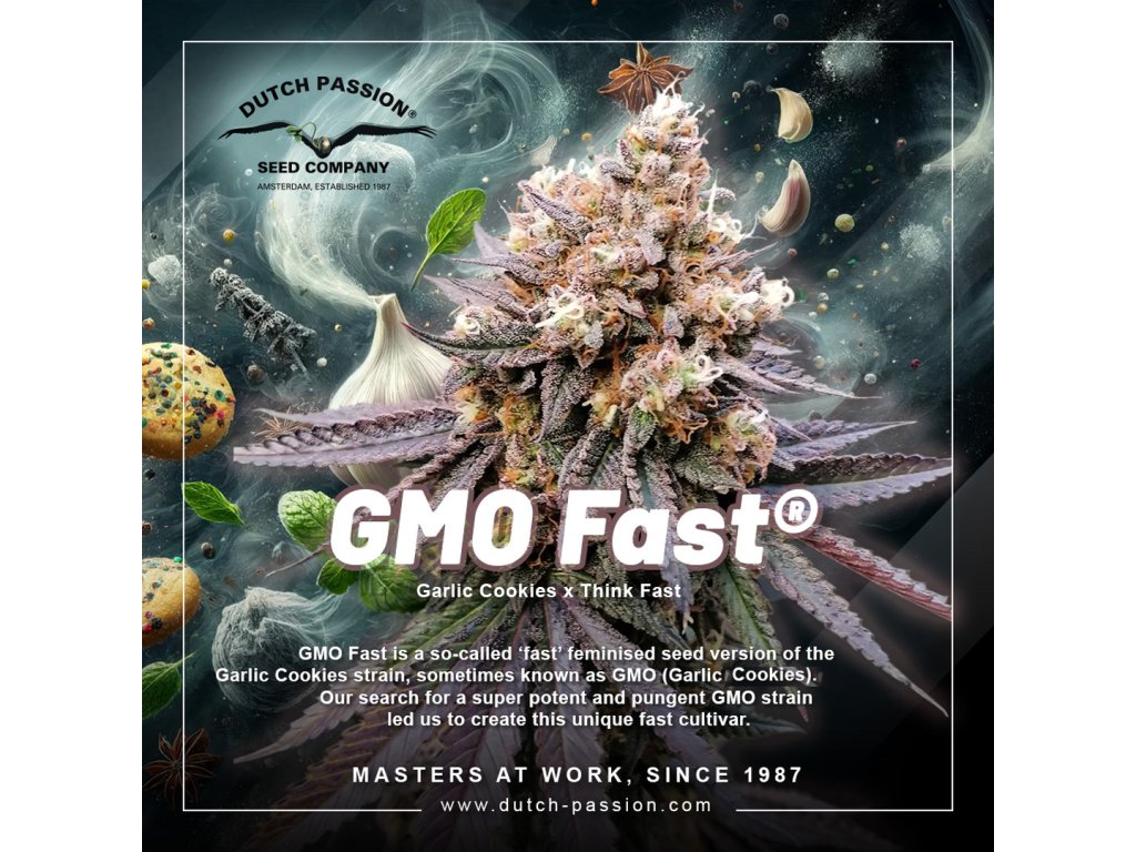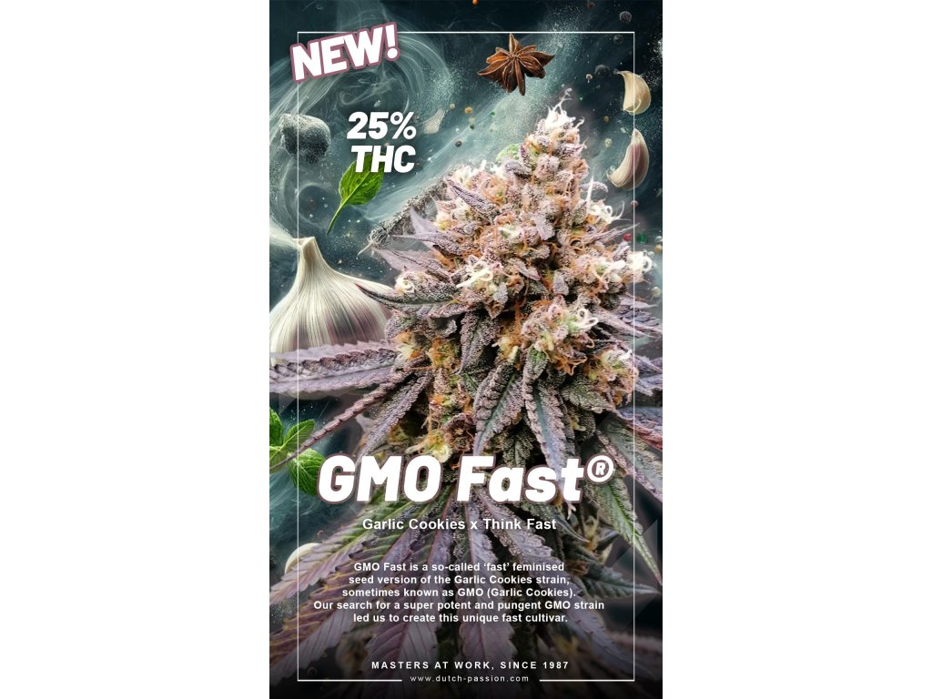 GMO Fast od Dutch Passion je prémiová fotoperiodická odrůda vzniklá křížením Garlic Cookies (GMO) a Think Fast. Tento hybrid (indika/sativa) nabízí vysoký obsah THC (22–23 %) a dobu kvetení 7–8 týdnů v interiéru. Rostliny dorůstají střední výšky a produkují husté, pryskyřičné květy s intenzivním aroma česneku, cibule a jemnými tóny máty. Díky recesivním autoflower genům je tato odrůda velmi rychlá a stabilní. Účinky jsou silné, relaxační a dlouhotrvající – ideální pro večerní užití nebo odpočinek. GMO Fast je vhodná pro pěstování v temperovaných klimatech, kde lze venku sklízet již v září (na severní polokouli). Výnosy dosahují vysokých hodnot jak v interiéru, tak venku. Doporučuje se použití kvalitního LED osvětlení pro maximalizaci terpenového profilu a obsahu kanabinoidů. Tato odrůda je oblíbená mezi pěstiteli hledajícími rychlé sklizně, vysokou kvalitu a jedinečné aroma.Doplňkové parametry