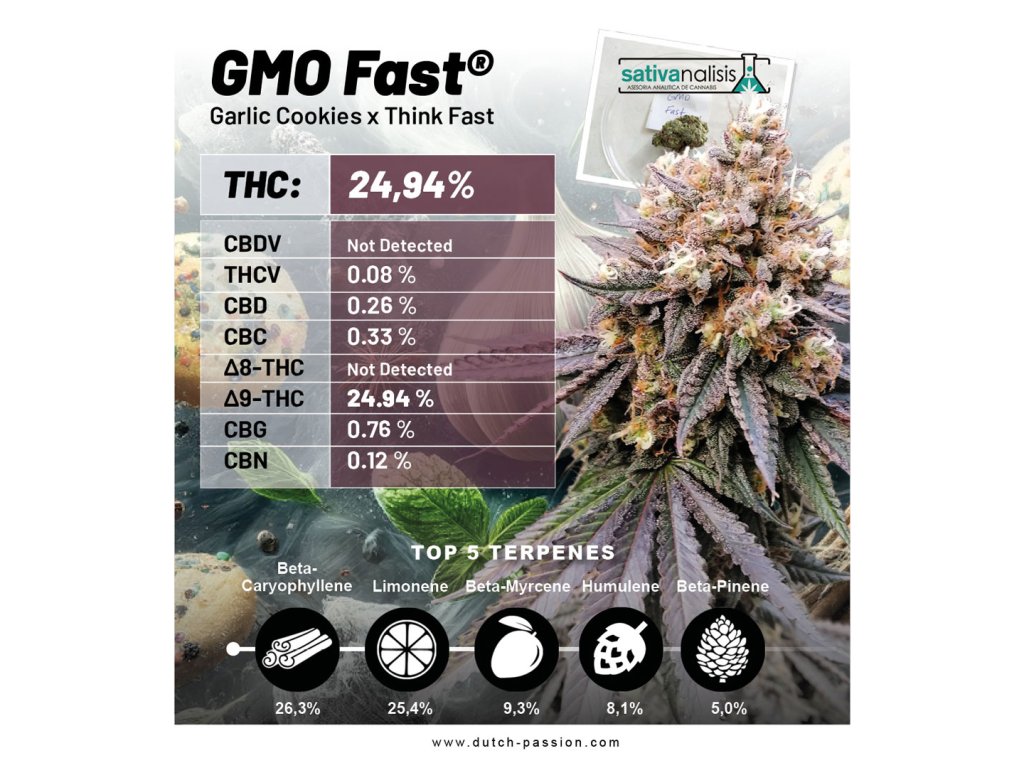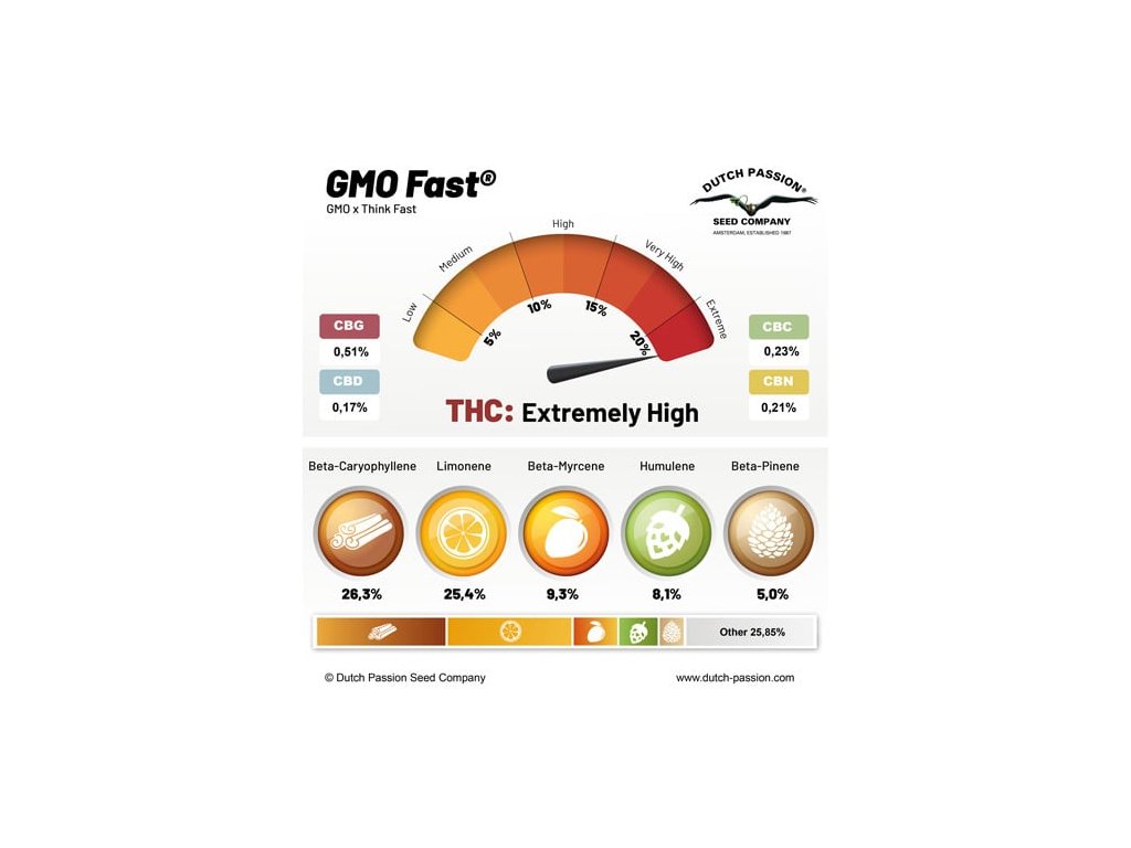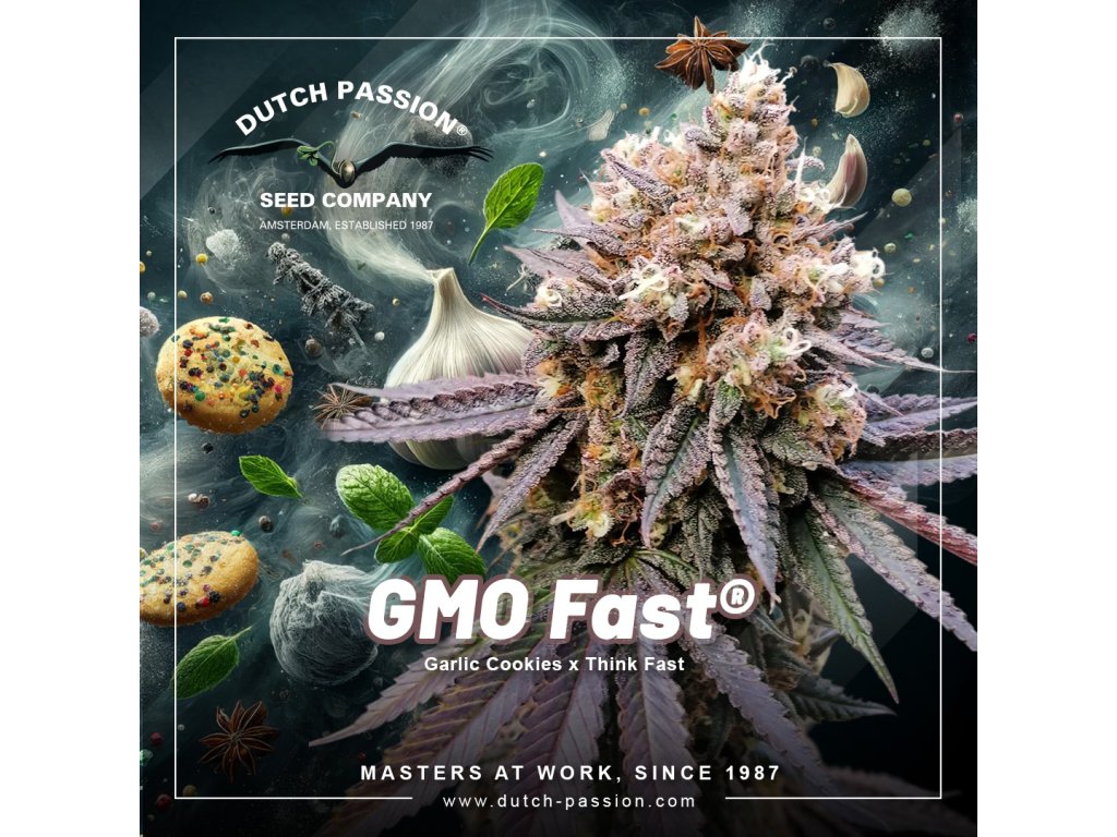 GMO Fast od Dutch Passion je prémiová fotoperiodická odrůda vzniklá křížením Garlic Cookies (GMO) a Think Fast. Tento hybrid (indika/sativa) nabízí vysoký obsah THC (22–23 %) a dobu kvetení 7–8 týdnů v interiéru. Rostliny dorůstají střední výšky a produkují husté, pryskyřičné květy s intenzivním aroma česneku, cibule a jemnými tóny máty. Díky recesivním autoflower genům je tato odrůda velmi rychlá a stabilní. Účinky jsou silné, relaxační a dlouhotrvající – ideální pro večerní užití nebo odpočinek. GMO Fast je vhodná pro pěstování v temperovaných klimatech, kde lze venku sklízet již v září (na severní polokouli). Výnosy dosahují vysokých hodnot jak v interiéru, tak venku. Doporučuje se použití kvalitního LED osvětlení pro maximalizaci terpenového profilu a obsahu kanabinoidů. Tato odrůda je oblíbená mezi pěstiteli hledajícími rychlé sklizně, vysokou kvalitu a jedinečné aroma.Doplňkové parametry