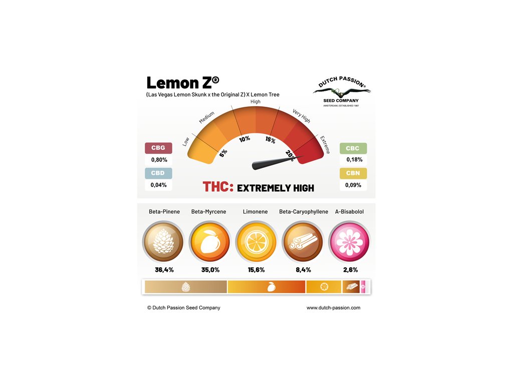Lemon Z od Dutch Passion je vylepšená verze původní Lemon Zkittle genetiky, která získala 1. místo na HighLife Cupu 2018 za nejlepší sativu a celkové vítězství. Tento hybrid (sativa-dominantní) vznikl křížením Las Vegas Lemon Skunk, Original Z (Zkittle) a Lemon Tree. Nabízí vysoký obsah THC (průměrně 20 %, ale může být i vyšší) a dobu kvetení 8–9 týdnů. Rostliny dorůstají střední výšky a produkují kompaktní, pryskyřičné květy s intenzivním sladkokyselým citronovým aroma. Účinky jsou povznášející, energické a dlouhotrvající – ideální pro denní užití nebo kreativní činnosti. Výnosy dosahují XL hodnot v interiéru i exteriéru za optimálních podmínek. Lemon Z je snadno pěstovatelná odrůda vhodná pro SCROG techniky i přirozený růst. Doporučuje se pěstování v suchém prostředí s nízkou vlhkostí během kvetení. Tato odrůda zaujme svou stabilitou, rychlejším kvetením a jedinečným terpenovým profilem, který potěší všechny milovníky citrusových chutí.Doplňkové parametry