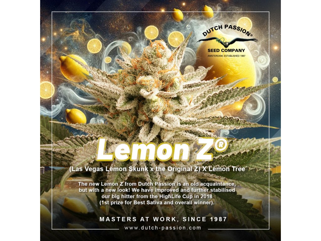 Lemon Z od Dutch Passion je vylepšená verze původní Lemon Zkittle genetiky, která získala 1. místo na HighLife Cupu 2018 za nejlepší sativu a celkové vítězství. Tento hybrid (sativa-dominantní) vznikl křížením Las Vegas Lemon Skunk, Original Z (Zkittle) a Lemon Tree. Nabízí vysoký obsah THC (průměrně 20 %, ale může být i vyšší) a dobu kvetení 8–9 týdnů. Rostliny dorůstají střední výšky a produkují kompaktní, pryskyřičné květy s intenzivním sladkokyselým citronovým aroma. Účinky jsou povznášející, energické a dlouhotrvající – ideální pro denní užití nebo kreativní činnosti. Výnosy dosahují XL hodnot v interiéru i exteriéru za optimálních podmínek. Lemon Z je snadno pěstovatelná odrůda vhodná pro SCROG techniky i přirozený růst. Doporučuje se pěstování v suchém prostředí s nízkou vlhkostí během kvetení. Tato odrůda zaujme svou stabilitou, rychlejším kvetením a jedinečným terpenovým profilem, který potěší všechny milovníky citrusových chutí.Doplňkové parametry