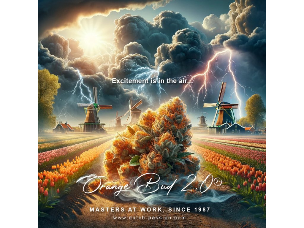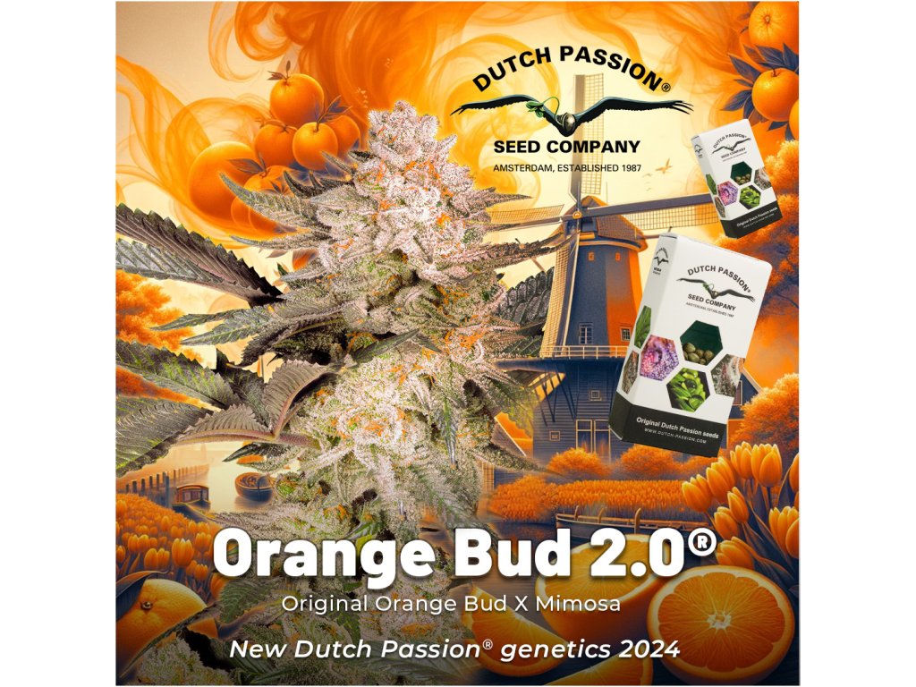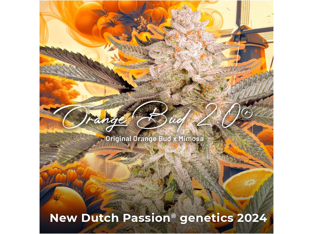 Orange Bud 2.0 od Dutch Passion je vylepšená verze původní klasiky Orange Bud, vzniklá křížením s aromatickou Mimosa (Clementine x Purple Punch). Tento hybrid (indika-dominantní) nabízí vysoký obsah THC (~20 %) a dobu kvetení 8–9 týdnů. Rostliny dorůstají kompaktní výšky (75–100 cm) a produkují husté, pryskyřičné květy s intenzivním aroma pomerančů, mandarinek a tropického ovoce. Účinky jsou silné, dlouhotrvající – kombinují relaxační tělesný efekt s euforickým "head high", ideální pro kreativitu nebo odpočinek. Výnosy dosahují až 400–500 g/m² v interiéru. Orange Bud 2.0 je snadno pěstovatelná odrůda vhodná pro SOG techniky i přirozený růst. Doporučuje se organické pěstování a použití uhlíkových filtrů kvůli silnému aroma během kvetení. Tato odrůda je oblíbená díky svému jedinečnému terpenovému profilu, kompaktním květům s vysokou vrstvou pryskyřice a snadnému pěstování.Doplňkové parametry