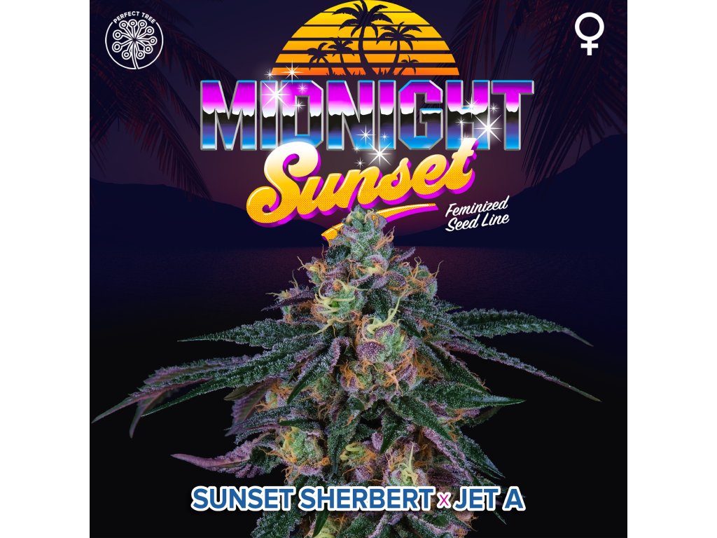 Midnight Sunset je feminizovaný indika-dominantní hybrid s genetikou Sunset Sherbert Bx1 x Jet A, který se vyznačuje rychlým kvetením, vysokou produkcí pryskyřice a intenzivními fyzickými účinky. Doba květu je 7–8 týdnů, přičemž výnos závisí na pěstitelských dovednostech, ale rostlina má silný růst a výrazný stretch během vegetativní fáze – doporučuje se topování pro lepší strukturu. Květy jsou sytě fialové s kontrastními oranžovými pestíky, což vytváří působivý vizuální efekt. Aroma je silně palivové, krémové a osvěžující, přičemž produkuje enormní množství pryskyřice, což z ní dělá ideální volbu pro extrakce. Účinky jsou intenzivně fyzické a hluboce relaxační, perfektní pro večerní odpočinek a uvolnění po dlouhém dni. Tento strain je ideální pro pěstitele hledající silnou indiku s výraznou palivovou vůní, luxusním fialovým vzhledem a prvotřídní produkcí pryskyřice vhodnou pro extrakce.