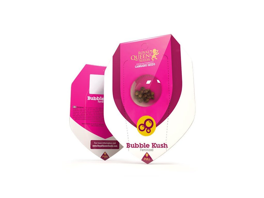 Bubble Kush je feminizovaný hybrid vzniklý křížením Bubble Gum a OG Kush. Má chuť zeminy, ovoce, pepře a borovice. Obsahuje 19 % THC a vyvolává relaxační a euforické účinky. V interiéru dorůstá do výšky 80–140 cm a produkuje až 600 g/m² po 8-10 týdnech kvetení. Venku dorůstá do výšky 200 cm s výnosem 650 g/rostlina, sklizeň je koncem září. Rodiče: Bubble Gum x OG Kush, Obsah THC: 19 %, Chuť: zemina, ovoce, pepř, borovice, Výnos indoor: až 600 g/m², Výnos outdoor: 650 g/rostlina, Výška indoor: 80–140 cm, Výška outdoor: 200 cm, Doba kvetení: 8–10 týdnů, Sklizeň: konec září, Účinky: relaxační, euforické.Doplňkové parametry