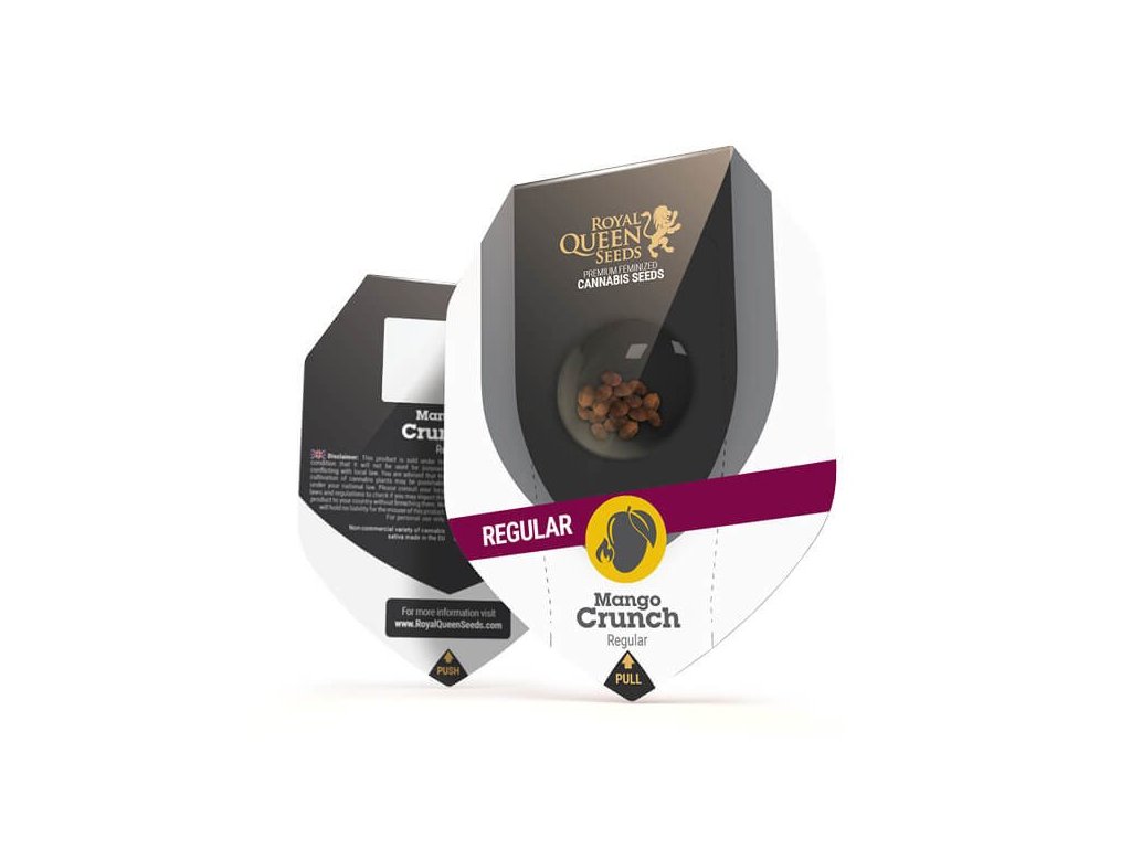 Mango Crunch je hybrid (80% sativa, 20% indica) vzniklý křížením Mango Haze a Sour Diesel (Super Skunk x Chemdawg 91) nebo staré Indicy ze Severního Nizozemí a sativového hybridu ze Smaragdového Trojúhelníku v severní Kalifornii. Má vůni a chuť manga, ananasu a dalšího šťavnatého ovoce, s tóny cukroví, grapefruitu a nafty. Obsahuje 16-20 % THC a nízký obsah CBD, což vyvolává euforické, povznášející a relaxační účinky, pomáhá proti nespavosti a bolesti, a je proto vhodná pro denní i noční užití. V interiéru dorůstá do výšky 90-140 cm (1-1,7 m) a produkuje 450-500 g/m² po 8-9 týdnech kvetení. Venku dorůstá do výšky 140-180 cm (1,7m) a produkuje 500-550 g/rostlina, sklizeň je začátkem října. Je snadná na pěstování, a proto je vhodná pro začátečníky i zkušené pěstitele, dobře reaguje na LST a prořezávání. Rodiče: Mango Haze x Sour Diesel, Chuť: mango, ananas, grapefruit, diesel, bonbóny, Doba kvetení: 8–9 týdnů, Sklizeň: začátek října, Výnos indoor: 450-500 g/m², Výnos outdoor: 500-550 g/rostlina, Výška indoor: 90-140 cm, Výška outdoor: 140-180 cm (až 1,7 m), Obsah THC: 16-20 %, Obsah CBD: nízký (méně než 1%), Účinky: euforické, relaxační, proti bolesti, problémy se spánkem.Doplňkové parametry