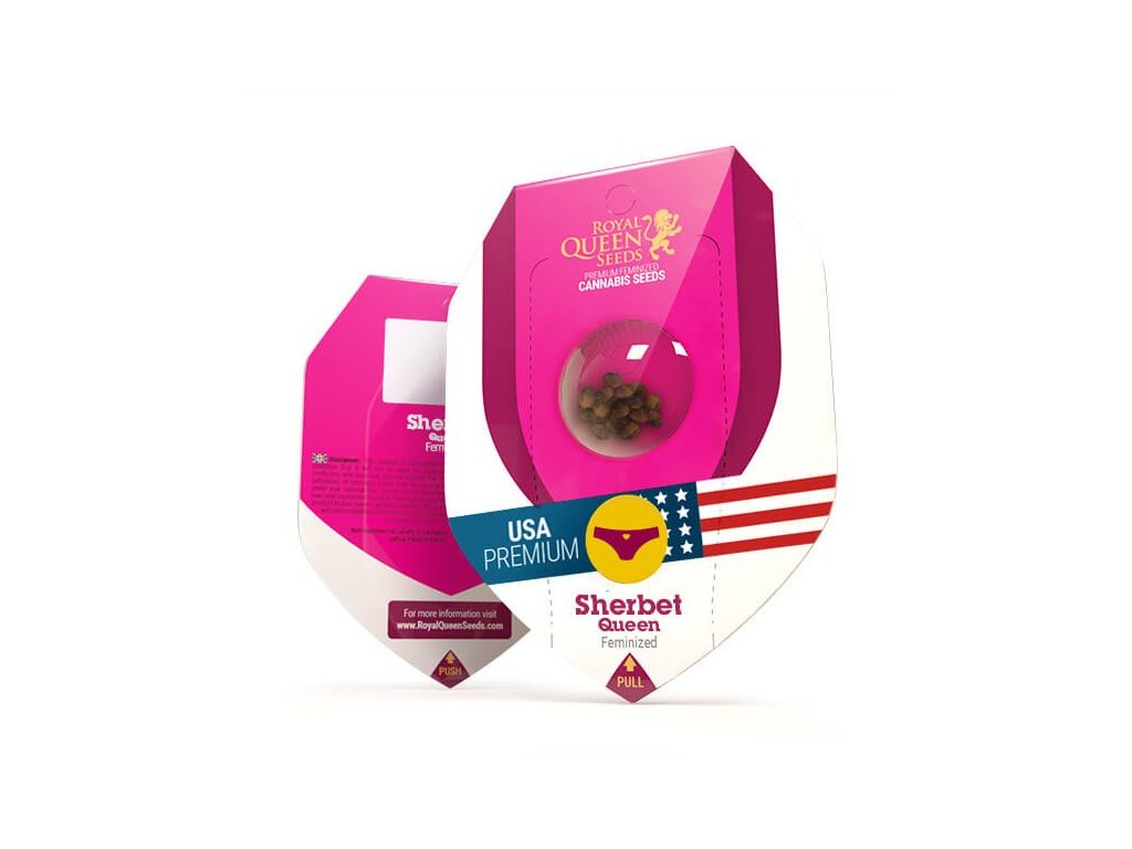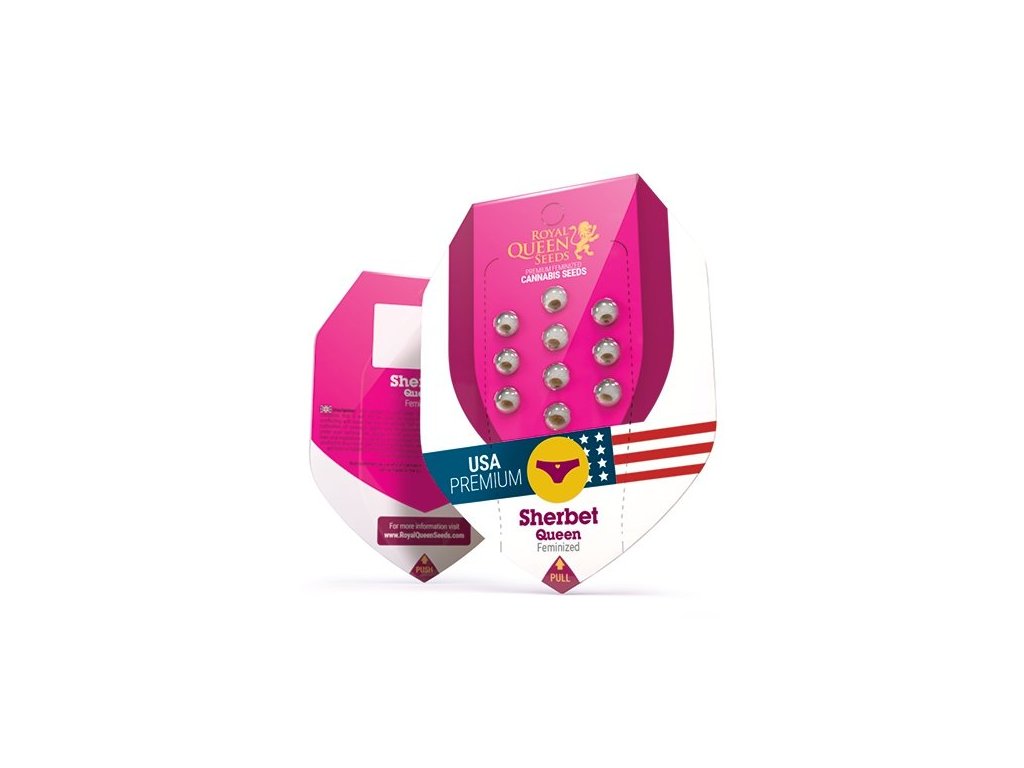 Sherbet Queen je hybrid (85% indica, 15% sativa) vzniklý křížením Pink Panties a Sunset Sherbet, který je sám o sobě křížencem Pink Panties a Girl Scout Cookies. Má ovocnou a zemitou chuť s vůní jako směs lesních plodů a citrusů. Obsahuje 24% THC a nízký obsah CBD, což vyvolává silné relaxační účinky, vhodné pro zmírnění stresu, úzkosti a bolesti. Dorůstá do výšky 80-120 cm v interiéru a 140-180 cm venku a produkuje 450-525 g/m² v interiéru a 450-500 g/rostlina venku po 8-10 týdnech kvetení, sklizeň je začátkem října. Je odolná vůči plísním a vyžaduje minimální péči.Doplňkové parametry