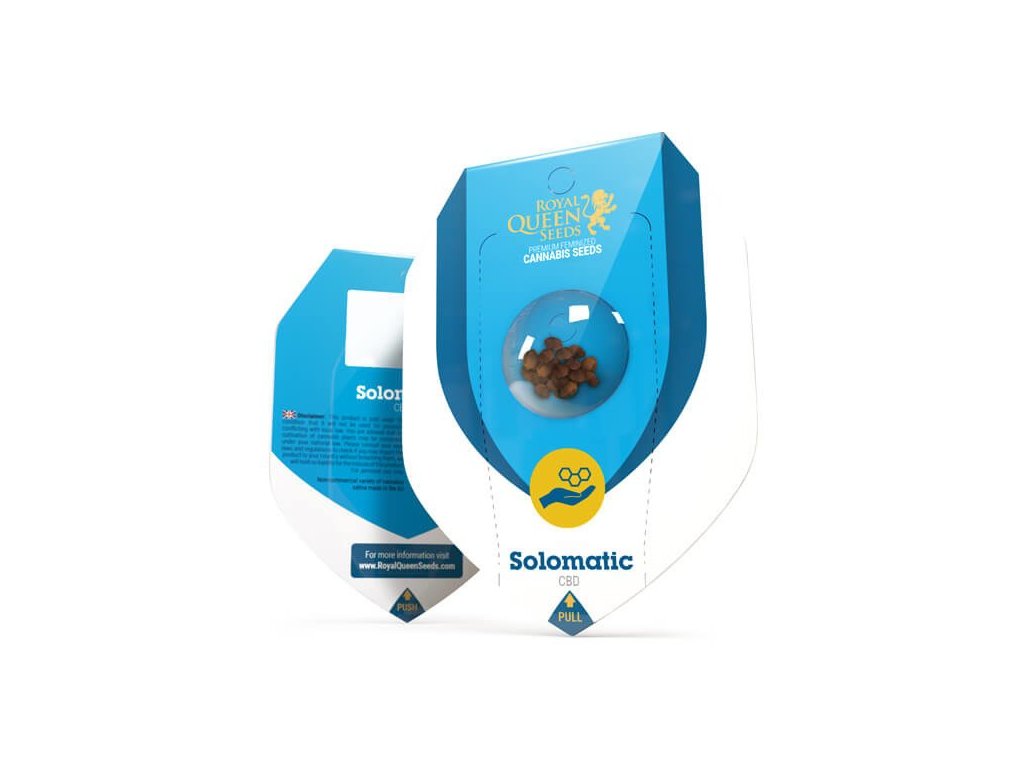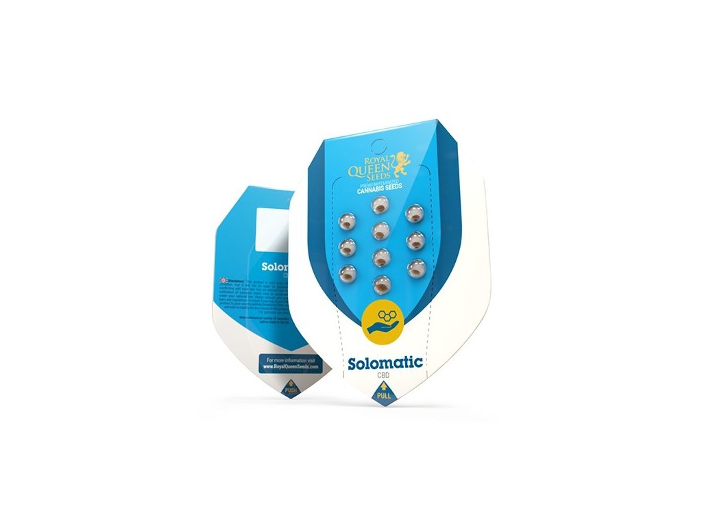 Solomatic CBD je hybrid (70% indica, 20% sativa, 10% ruderalis) vzniklý křížením Diesel CBD Auto a Asia CBD Auto. Má sladkou a ovocnou chuť s vůní jako směs citrusů, zázvoru a borovice. Obsahuje až 21% CBD a méně než 1% THC, což zajišťuje jasnou hlavu a léčebné účinky bez psychoaktivních efektů. Dorůstá do výšky 90-120 cm v interiéru a 120-150 cm venku a produkuje 150-200 g/m² v interiéru a 30-80 g/rostlina venku po 9-11 týdnech od vyklíčení. Je vhodná pro začátečníky a pro pěstování v malých prostorech.Doplňkové parametry