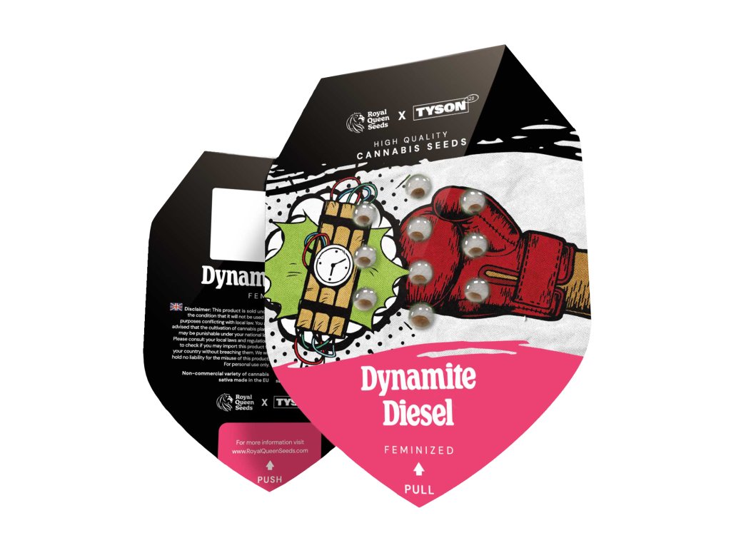 Dynamite Diesel je hybrid (65% indica, 35% sativa) vzniklý křížením Sour Diesel a Skywalker OG. Má zemní a ovocné aroma s vůní jako směs citrusů, pepře a zeminy. Obsahuje 22% THC a nízký obsah CBD, což vyvolává silně relaxační účinky na tělo a kreativní účinky na mysl, vhodné pro večer nebo odpočinek. Dorůstá do výšky 100-150 cm v interiéru a 150-200 cm venku a produkuje 500-550 g/m² v interiéru a 625-675 g/rostlina venku po 9-10 týdnech kvetení, sklizeň je koncem října. Je vhodná pro zkušené uživatele a pro pěstování v různých prostředích. Dynamite Diesel byla vytvořena ve spolupráci s Mike Tysonem a Royal Queen Seeds, což ji činí jedinečnou odrůdou inspirovanou legendárním boxerem.Doplňkové parametry