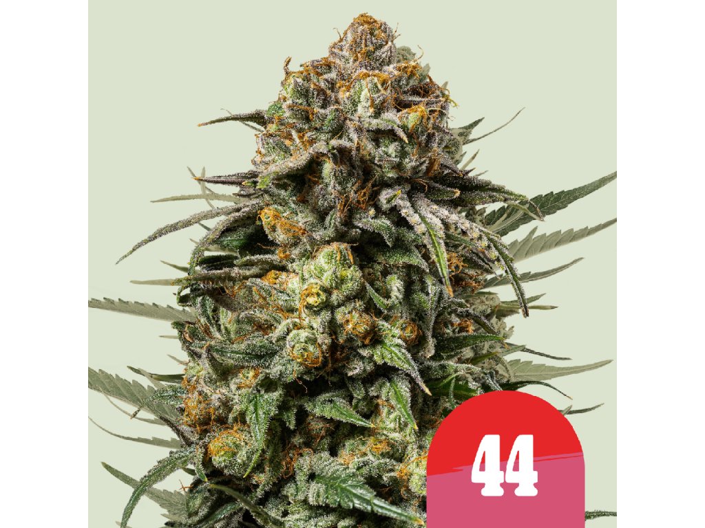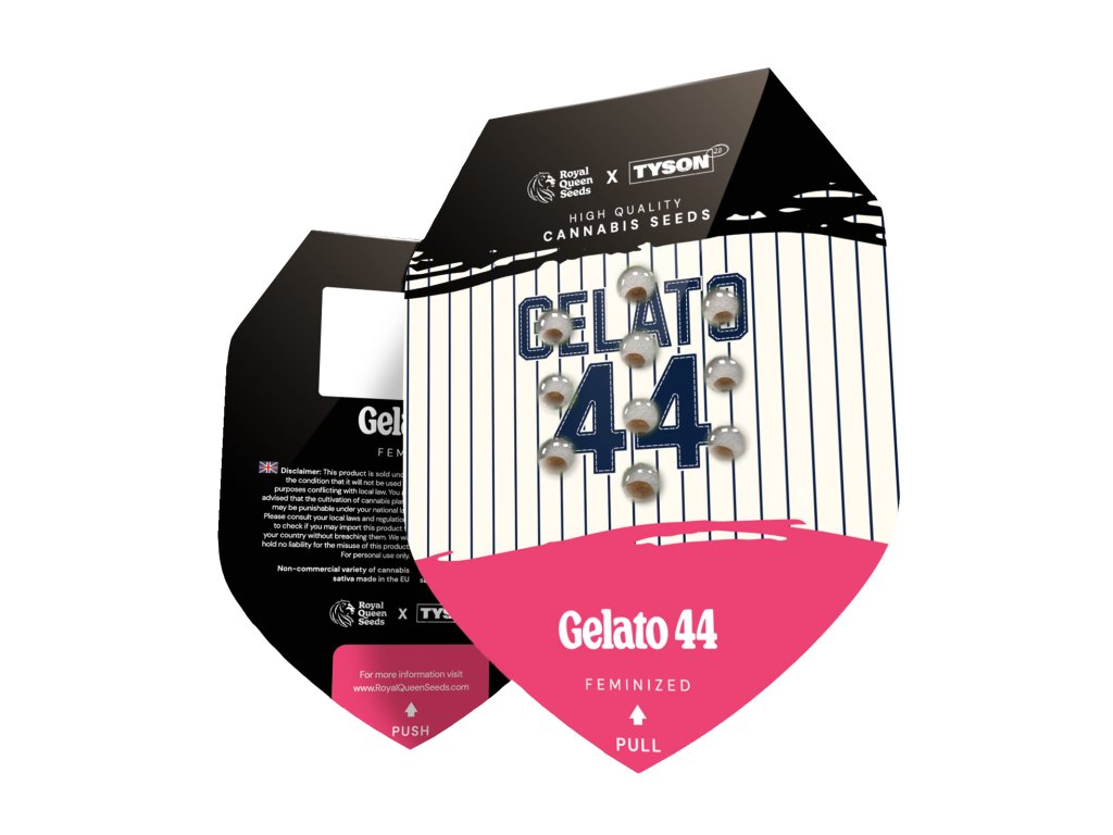 Gelato 44 je hybrid (75% indica, 25% sativa) vzniklý křížením Sunset Sherbet a Thin Mint Girl Scout Cookies. Má komplexní aroma s vůní jako směs citrusů, ovoce, zeminy a cookies. Obsahuje 22% THC a nízký obsah CBD, což vyvolává silně relaxační účinky na tělo a kreativní účinky na mysl, vhodné pro večer nebo odpočinek. Dorůstá do výšky 80-120 cm v interiéru a 140-180 cm venku a produkuje 400-450 g/m² v interiéru a 550-600 g/rostlina venku po 8-9 týdnech kvetení, sklizeň je koncem září. Je vhodná pro zkušené uživatele a pro pěstování v různých prostředích. Gelato 44 byla vytvořena ve spolupráci s Mike Tysonem a Royal Queen Seeds, což ji činí jedinečnou odrůdou inspirovanou legendárním boxerem.Doplňkové parametry