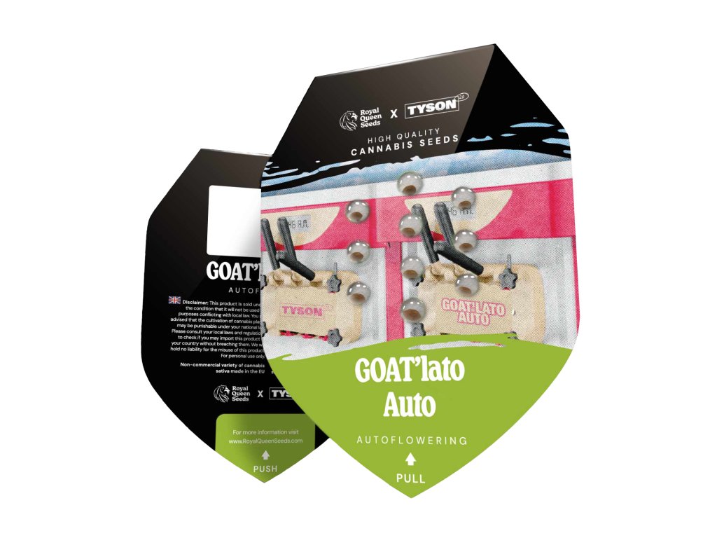 GOAT'lato Auto je hybrid (65% indica, 25% sativa, 10% ruderalis) vzniklý křížením Gelato 44 a Cookies Auto. Má komplexní aroma s vůní jako směs sušenek, ovoce a zeminy. Obsahuje 20% THC a nízký obsah CBD, což vyvolává silně relaxační a euforické účinky, vhodné pro večer nebo odpočinek. Dorůstá do výšky 70-120 cm v interiéru a 130-160 cm venku a produkuje 375-450 g/m² v interiéru a 130-180 g/rostlina venku po 10-11 týdnech od vyklíčení. Je vhodná pro začátečníky a pro pěstování v různých prostředích. GOAT'lato Auto byla vytvořena ve spolupráci s Mike Tysonem a Royal Queen Seeds, což ji činí jedinečnou odrůdou inspirovanou legendárním boxerem.Doplňkové parametry