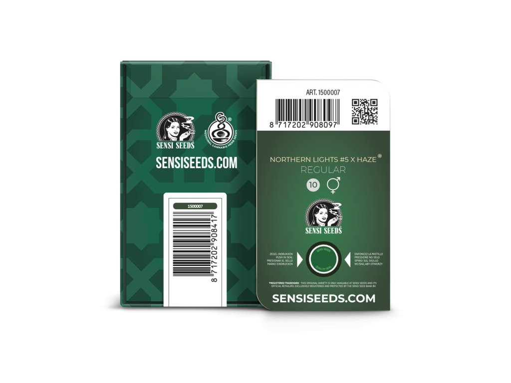 Northern Light #5 x Haze je 70 % sativa / 30 % indika, vzniklá křížením Northern Lights #5 a Haze. Rostlina dosahuje výšky až 300 cm, kvete za 65–75 dní a produkuje velké výnosy. Aroma je kořeněné s tóny sladkosti, účinky jsou euforické a dlouhotrvající. Vhodná pro pěstitele hledající výnosnou sativu s komplexním účinkem.Doplňkové parametry