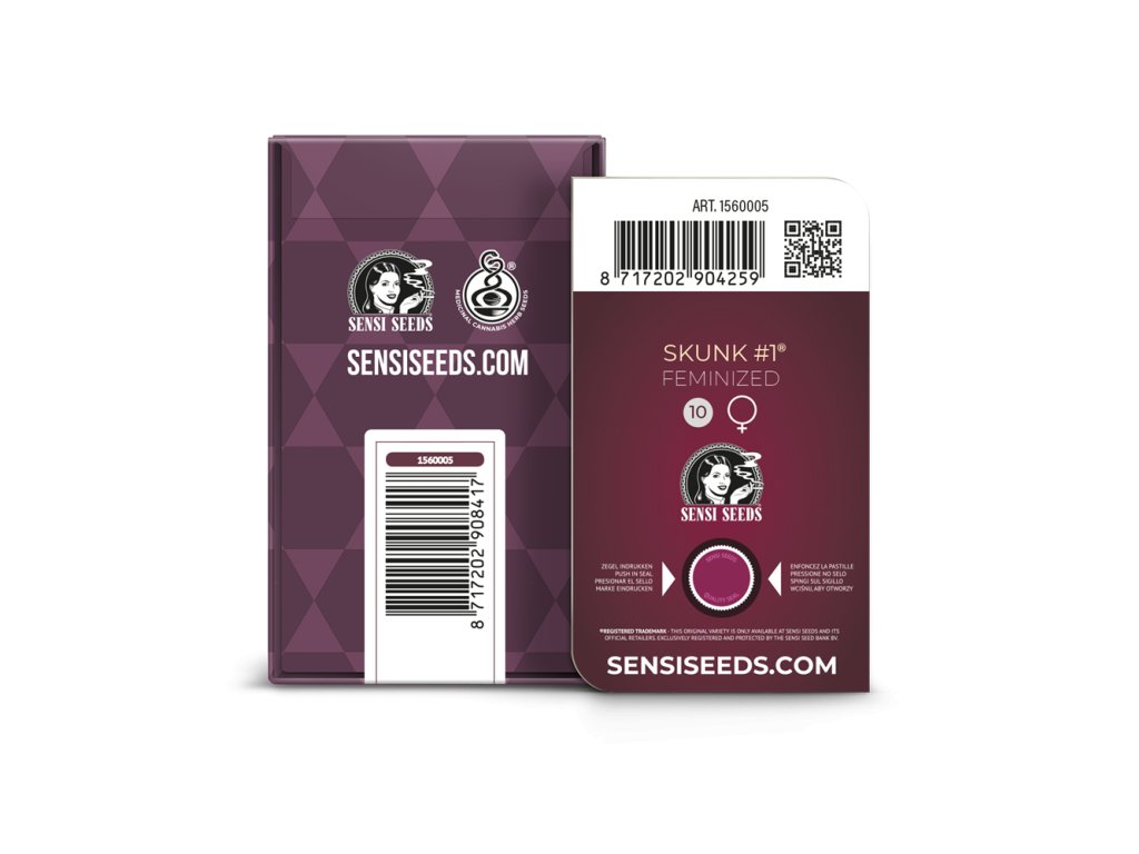 Skunk #1 je 65% indika / 35% sativa hybrid, vzniklý křížením Afghani, Acapulco Gold a Colombian Gold. Rostlina dosahuje výšky 120–150 cm, s dobou kvetení 45–50 dní. Výnos činí až 500 g/m? indoor. Aroma je typicky skunkové – zemité a sladké, účinky jsou vyvážené, kombinující euforii s fyzickou relaxací. Vhodná pro pěstitele hledající spolehlivou a výnosnou odrůdu.Doplňkové parametry