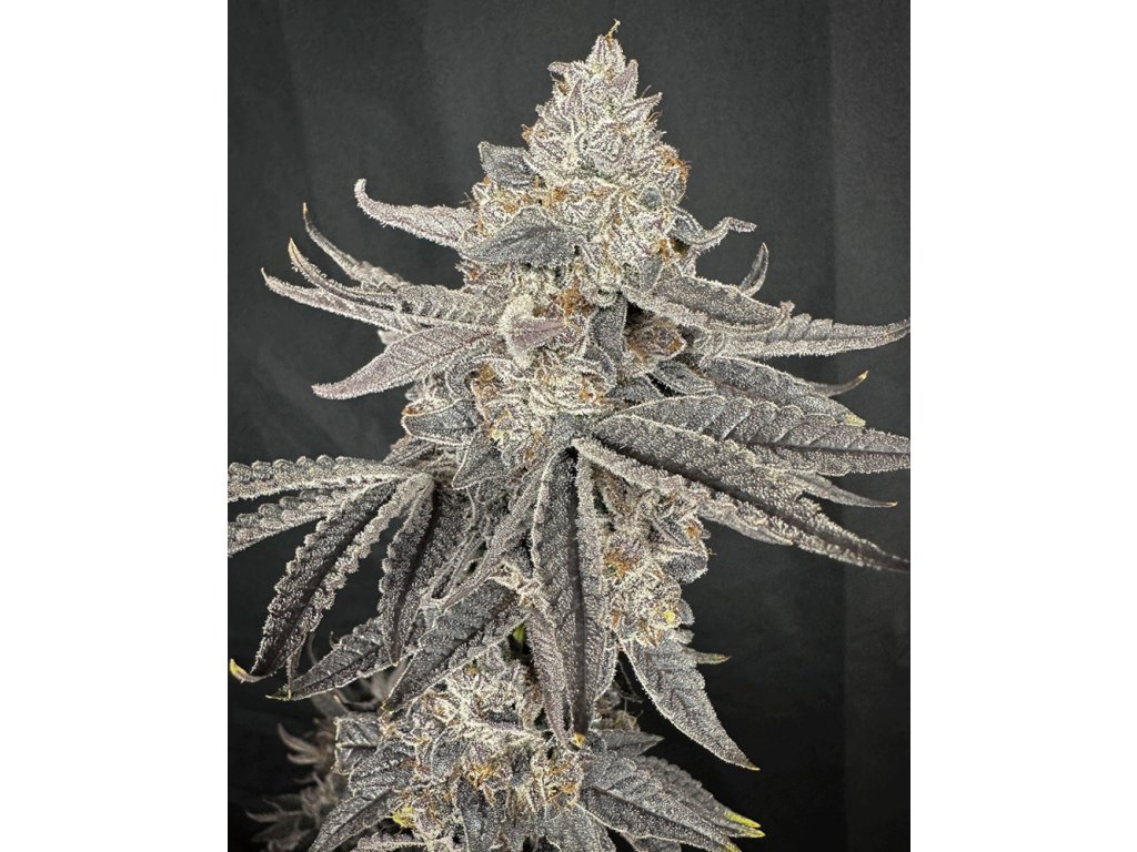 Indika-dominantní hybrid s aroma paliva a spálené gumy.
