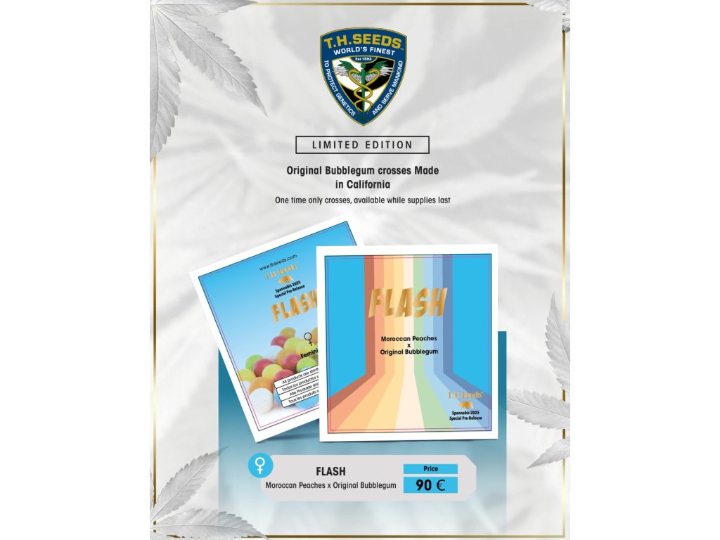 Flash od T.H. Seeds je indika-dominantní odrůda s krátkou dobou kvetení. Bližší informace o genetice, chuti, aroma, výšce, obsahu THC, výnosu a účincích nejsou k dispozici.